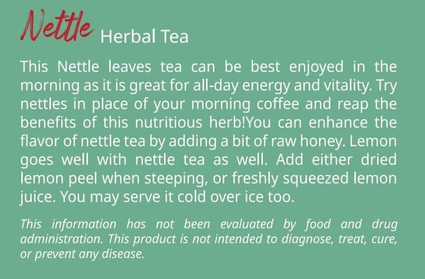 This Nettle leaves tea can be best enjoyed in the morning as it is great for all-day energy and vitality. Try nettles in place of your morning coffee and reap the benefits of this nutritious herb!You can enhance the flavor of nettle tea by adding a bit of raw honey. Lemon goes well with nettle tea as well. Add either dried lemon peel when steeping, or freshly squeezed lemon juice. You may serve it cold over ice too.